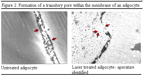 Dr. Niera concluded that adipocyte collapse was the result of the disrupted adipocyte membrane induced by laser irradiation. Work published by Dr. Solarte (2002) studied the visible light transmission spectra for different dissolution concentrations of adipocytes and observed changes in the optical transmittance of irradiated samples, and confirmed that morphological changes of adipocytes were the result of laser therapy.